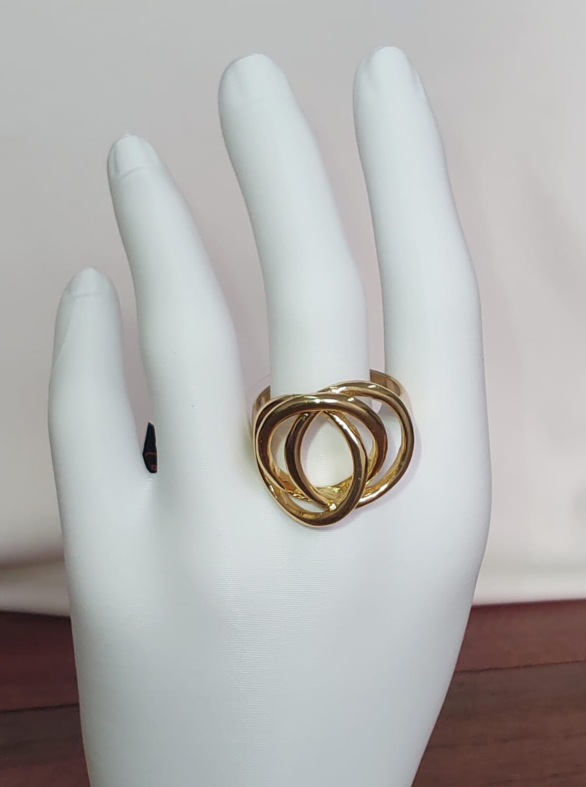 Anel moderno banhado a ouro 18k, com design orgânico e entrelaçado que cria um visual elegante e imponente. Sua estrutura fluida e polida traz sofisticação contemporânea, ideal para quem busca uma peça marcante e cheia de personalidade. Perfeito para compor looks estilosos e acrescentar um toque de glamour audacioso ao dia a dia ou a produções especiais.