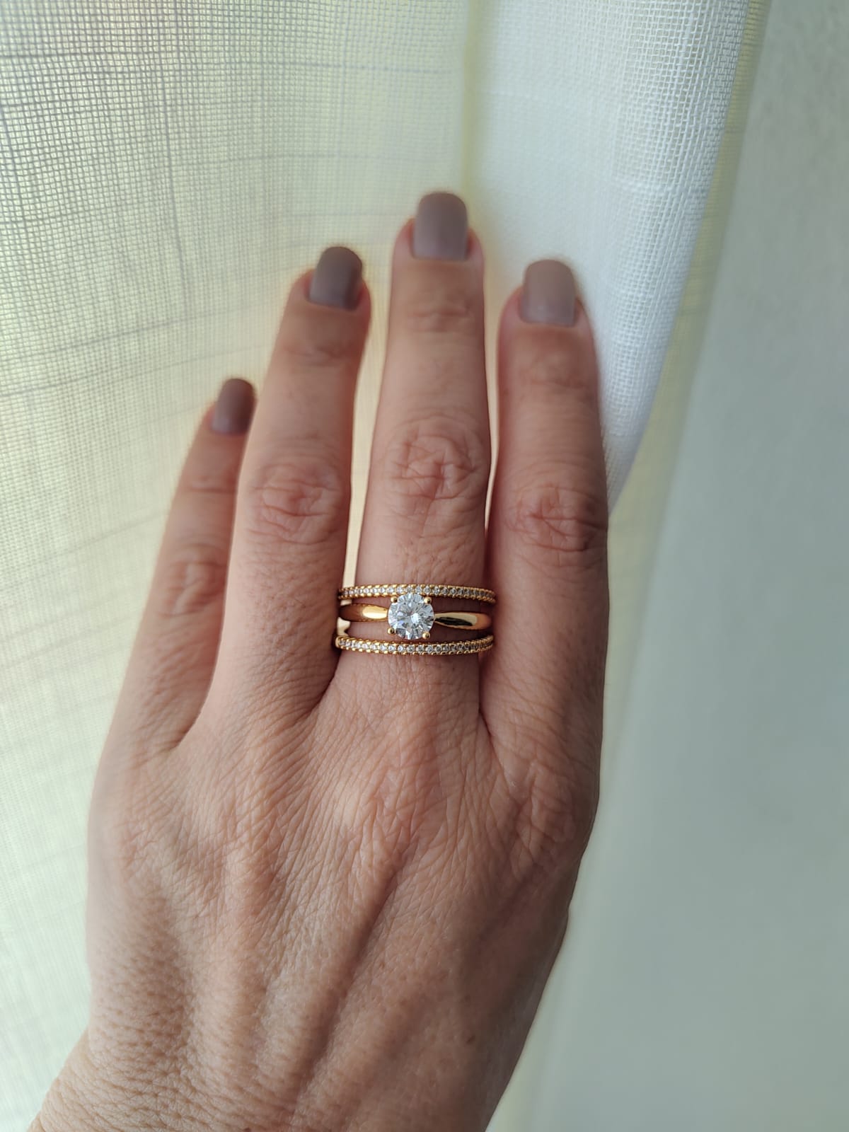 Conjunto de aneis combinando aparador fino delicado com solitário, ambos em zircônia cristal de alta qualidade, com o nosso banho exclusivo de ouro 18k, feito para te deixar com mãos de fada.