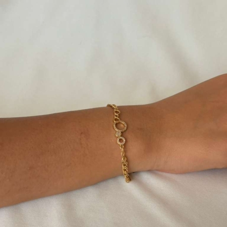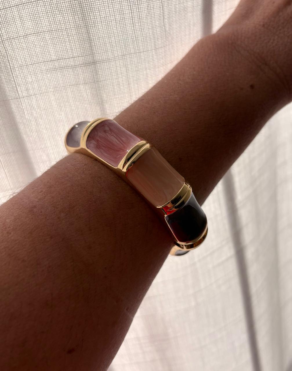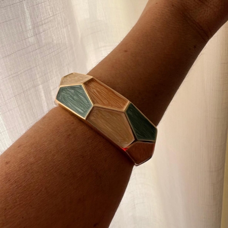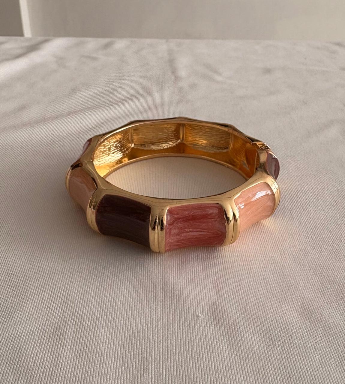 Pulseira bracelete em ouro com design facetado/octogonal. É adornada com painéis de resina em tons quentes de marrom, vinho e diferentes nuances de rosa. É uma peça chamativa e elegante.