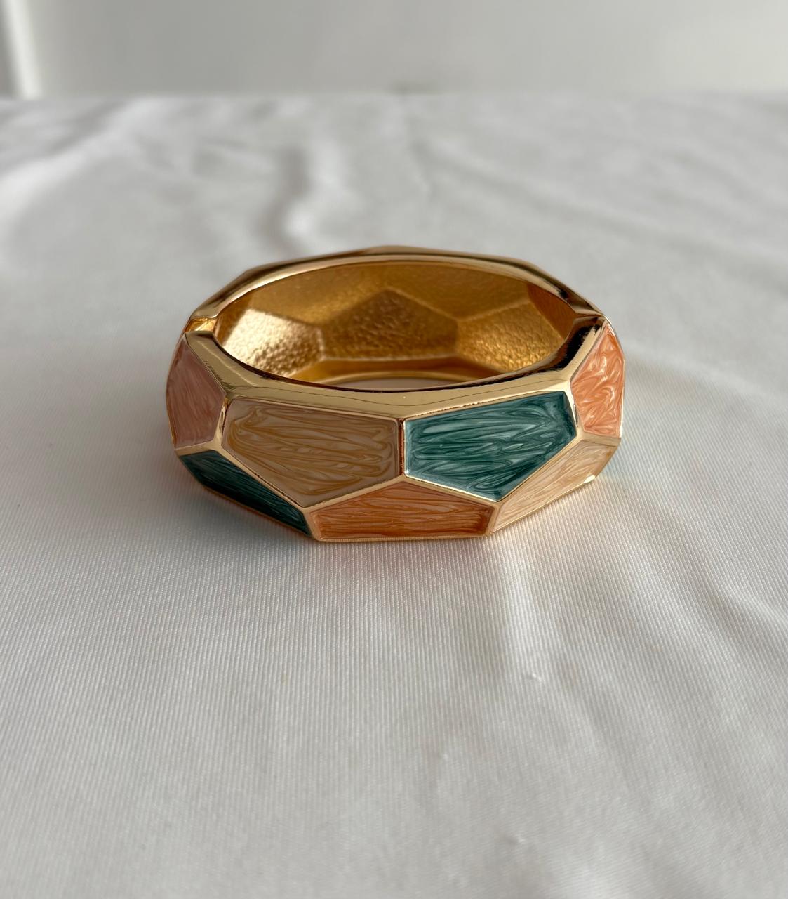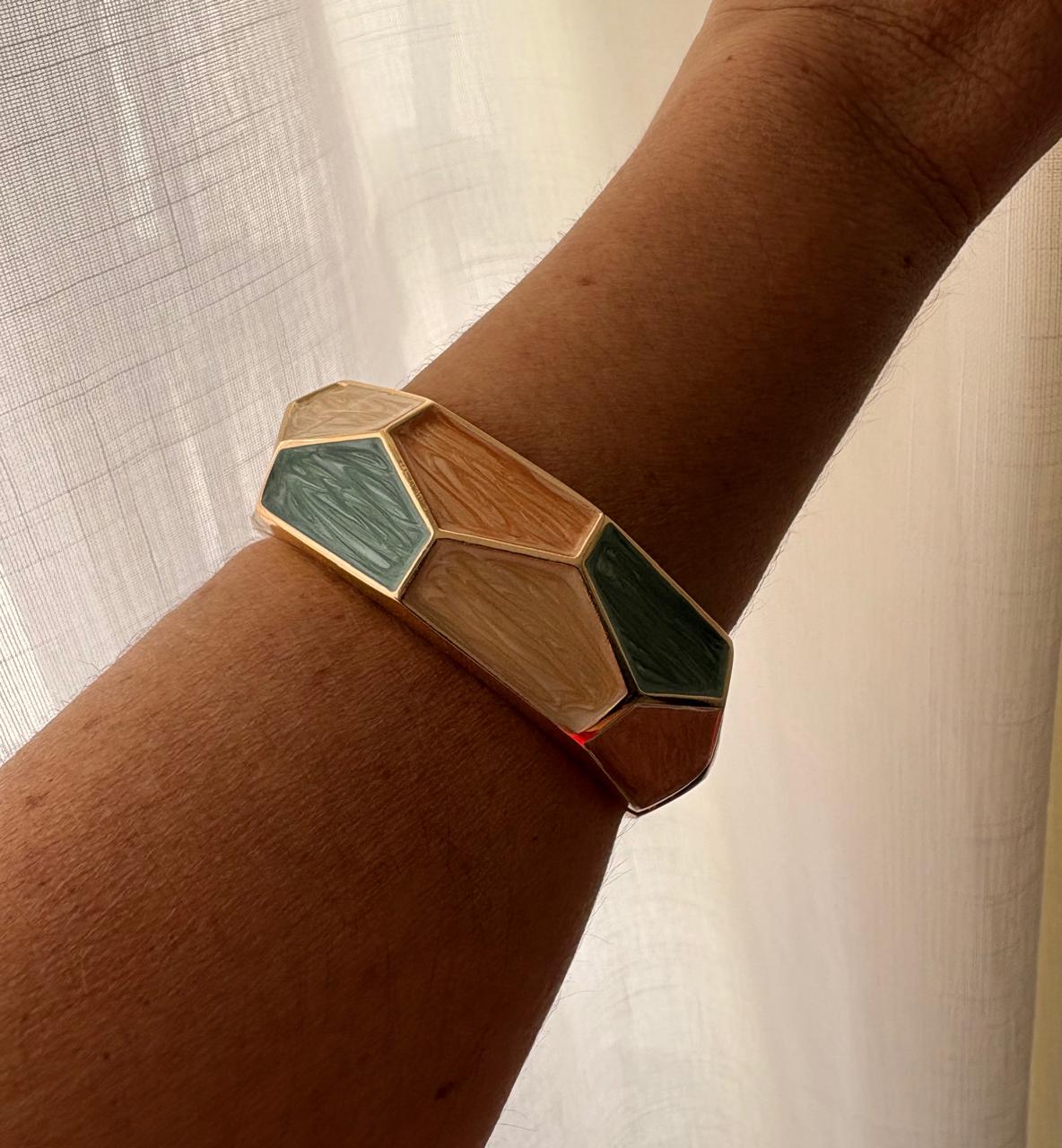 Este bracelete é maravilhoso! Possui um design geométrico facetado, com uma paleta de cores totalmente suave e em tons terrosos e pastéis.
