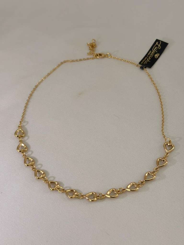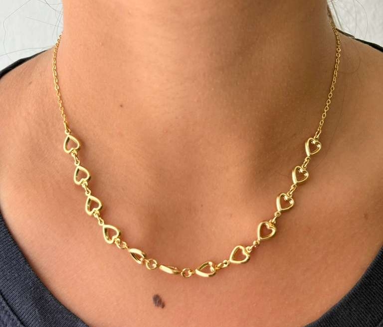 Uma gargantilha delicada e moderna, composta por uma corrente fina intercalada com pequenos pingentes em formato de coração vazado, distribuídos ao longo de toda a peça. Os corações, com seu design minimalista e leve, criam um visual elegante e sutil, adicionando um toque romântico sem excessos. O acabamento polido da corrente e dos pingentes reflete a luz suavemente, tornando uma gargantilha perfeita para complementar diferentes estilos, desde os mais casuais até os mais sofisticados.