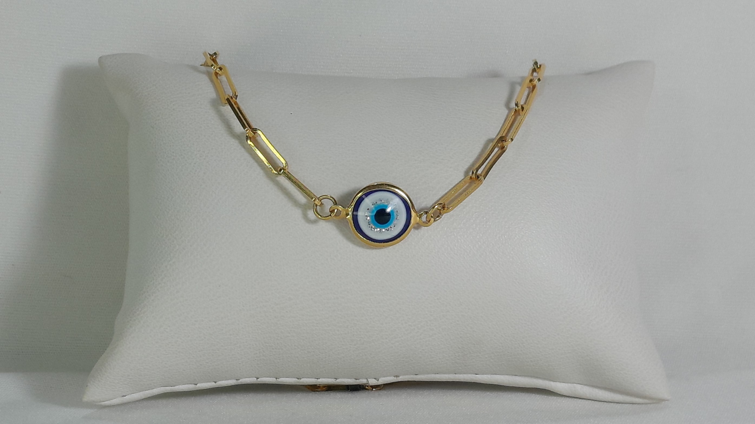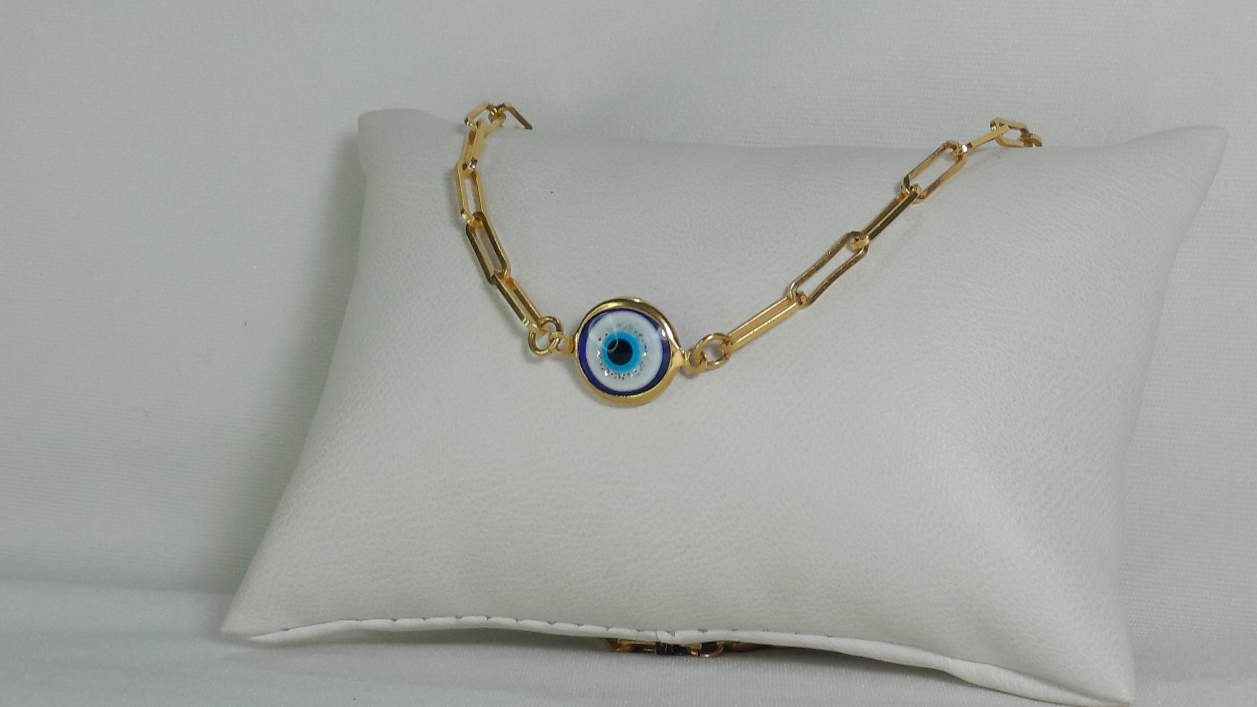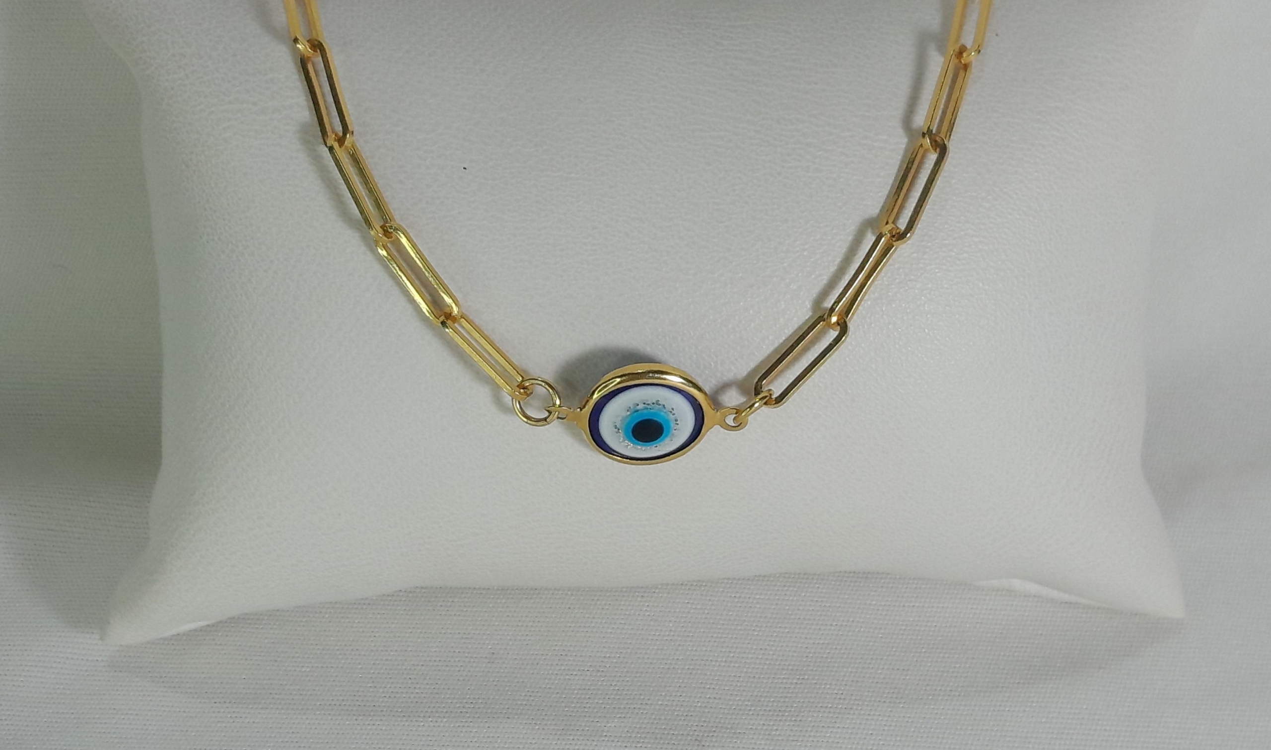 O colar apresentado nesta imagem é um modelo de cartier, confeccionado no banho em ouro 18k com acabamento altamente polido e brilhante. Conferindo um visual gracioso e belo. O design da corrente com um pingente de olho grego realça beleza e delicadeza a uma mulher, trazendo muita feminilidade e graciosidade.