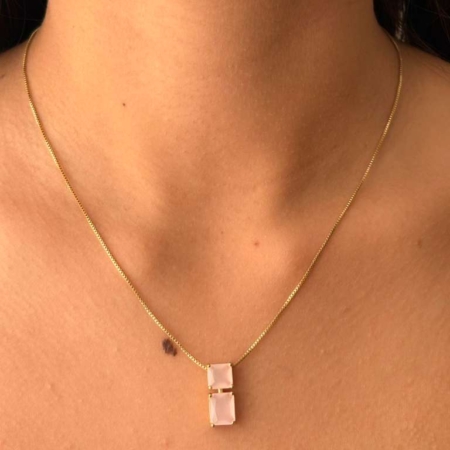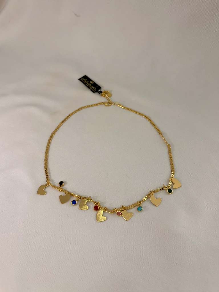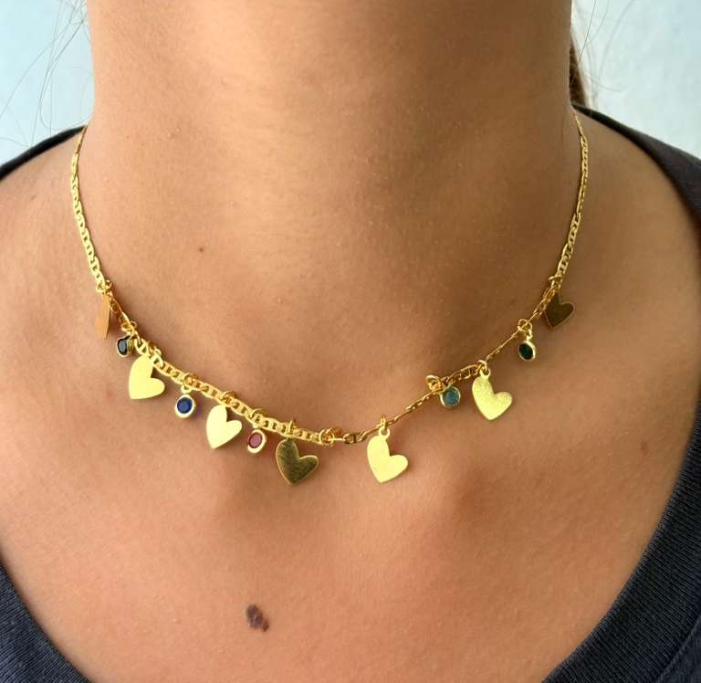 Este é um colar dourado delicado com pingentes variados ao longo de sua extensão. Ele apresenta pequenos corações metálicos e pedras coloridas em tons de azul, verde, rosa e vermelho, pendurados de maneira intercalada. A corrente possui um design trabalhado, que acrescenta um toque de sofisticação. O contraste entre o dourado e as pedras brilhantes cria um visual elegante e feminino, ideal para complementar looks casuais ou formais.