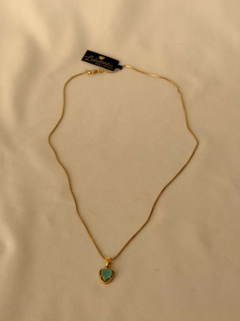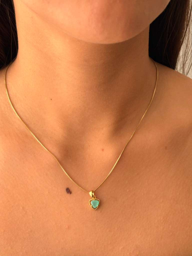 Este é um colar elegante com corrente dourada fina e um pingente em forma de gota. O destaque do pingente é a pedra central facetada, que neste modelo está em tom rubi, com variações disponíveis em rosé e ciano, criando um efeito translúcido e delicado. A gota é cercada por uma moldura dourada, complementando o brilho da corrente e realçando a pedra. É uma peça minimalista e sofisticada, perfeita para ocasiões formais ou para adicionar um toque de cor a um visual discreto.