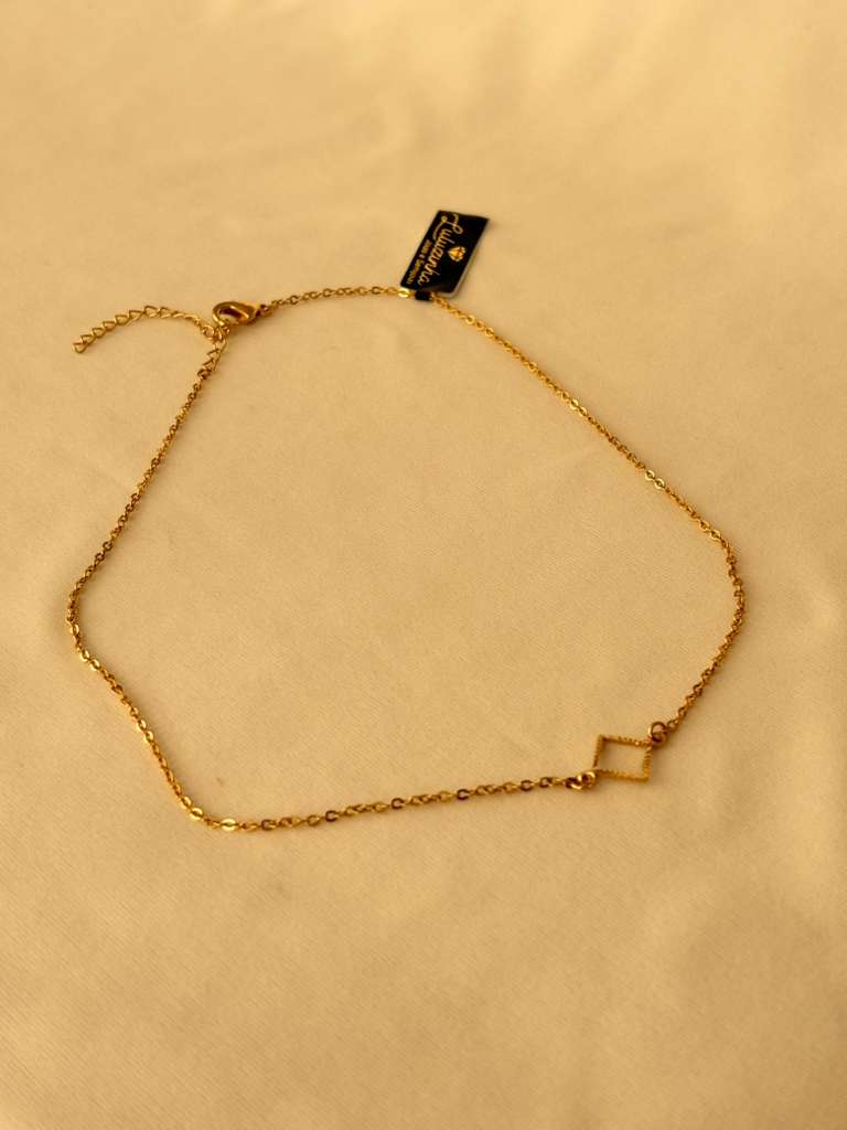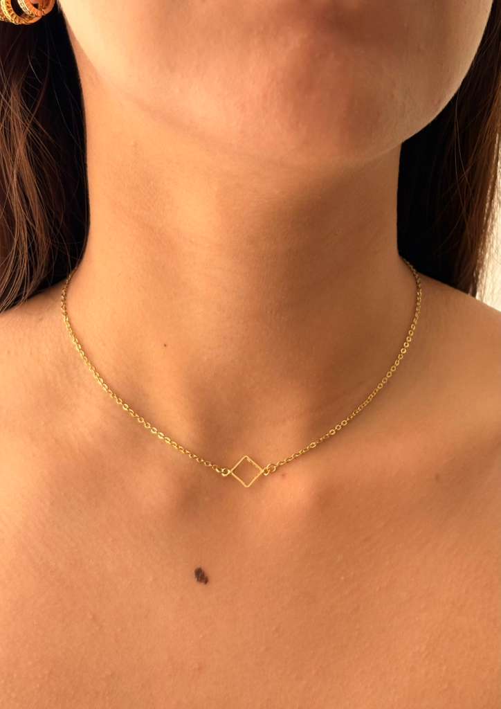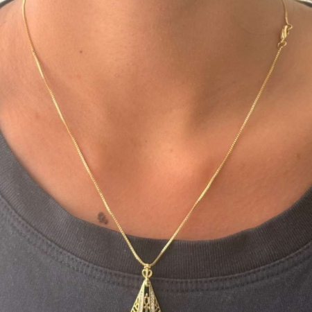 O colar apresentado nesta imagem é um modelo losango, confeccionado no banho em ouro 18k com acabamento altamente polido e brilhante. Conferindo um visual gracioso e belo. O design da corrente com pingente em formato losangolo realça beleza e delicadeza a uma mulher, trazendo muita feminilidade e graciosidade.