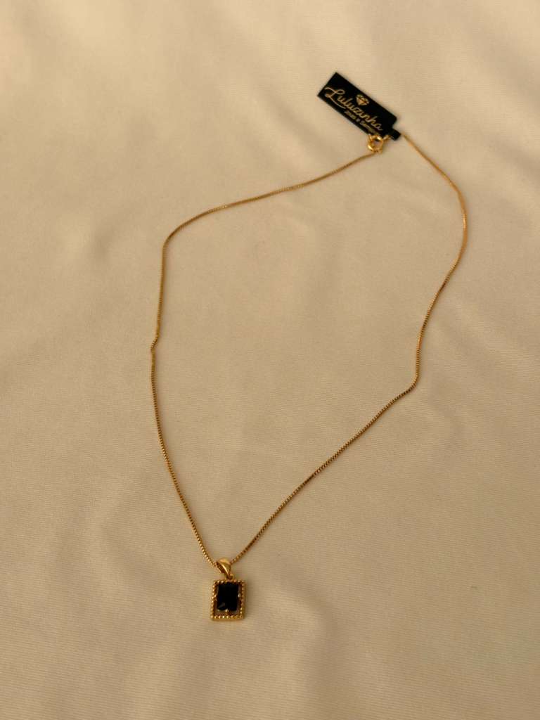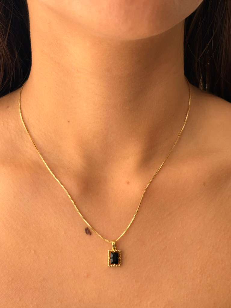 Este é um colar elegante com corrente dourada fina e um pingente em forma de quadrado. O destaque do pingente é a pedra central facetada, que neste modelo está em tom branco leitoso, com variações disponíveis em azul e ciano, criando um efeito translúcido e delicado. O quadrado é cercado por uma moldura dourada, complementando o brilho da corrente e realçando a pedra. É uma peça minimalista e sofisticada, perfeita para ocasiões formais ou para adicionar um toque de cor a um visual discreto.