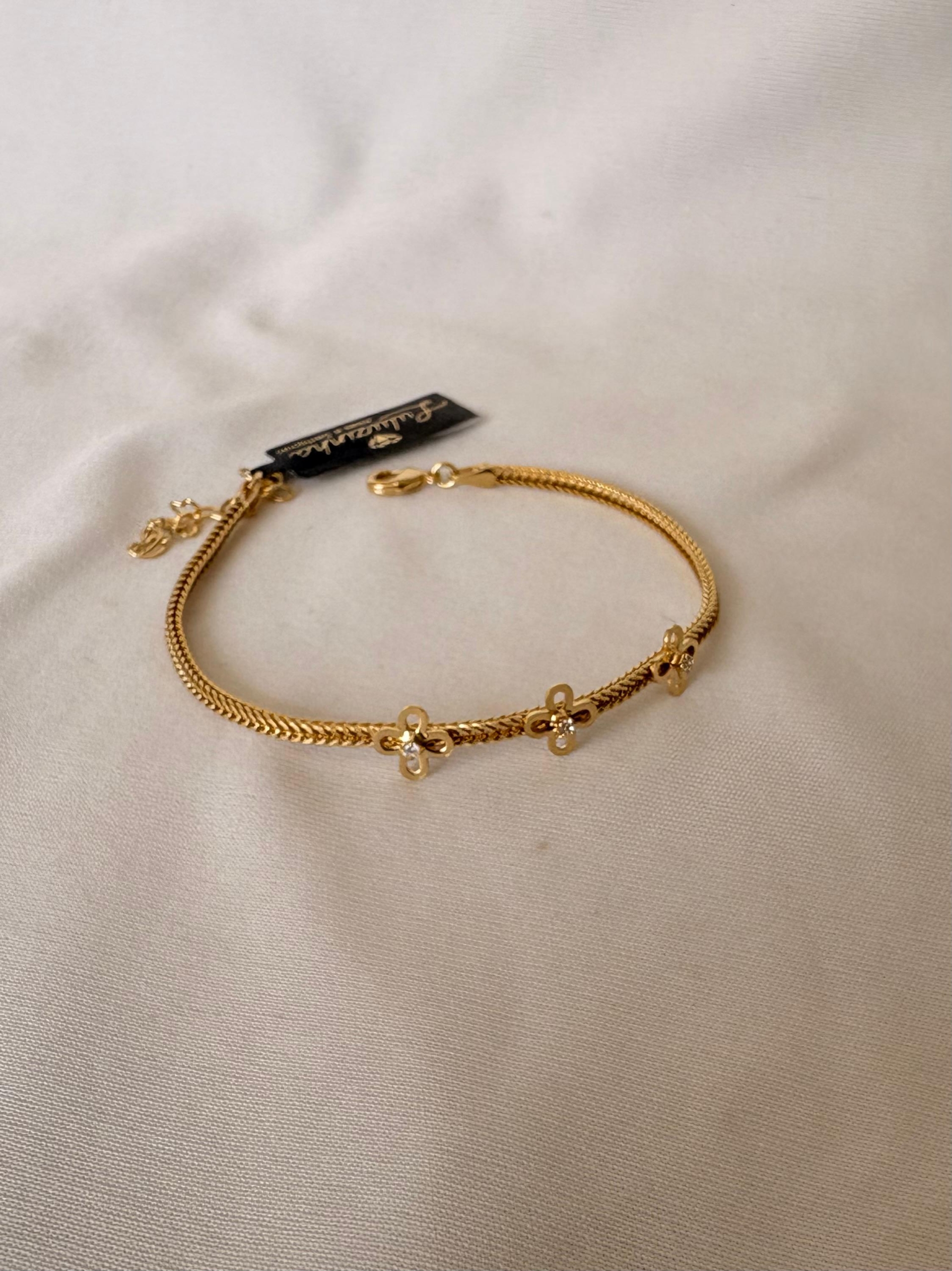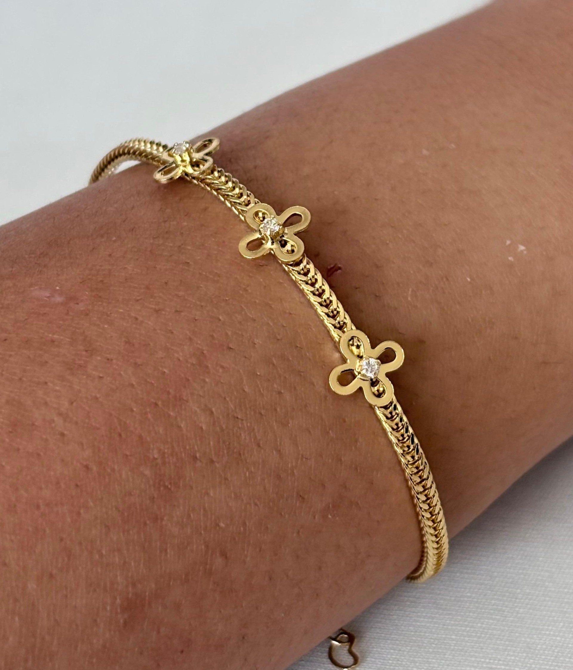 Pulseira 3 Margaridas em fio italiano banhado a ouro 18k. Modelo leve, resistente e com acabamento fino. Três flores centrais com detalhe em zircônia garantem brilho sutil. Ideal para uso diário ou composições elegantes. Design versátil, delicado e atemporal.