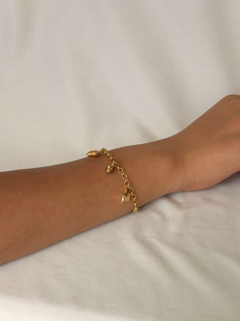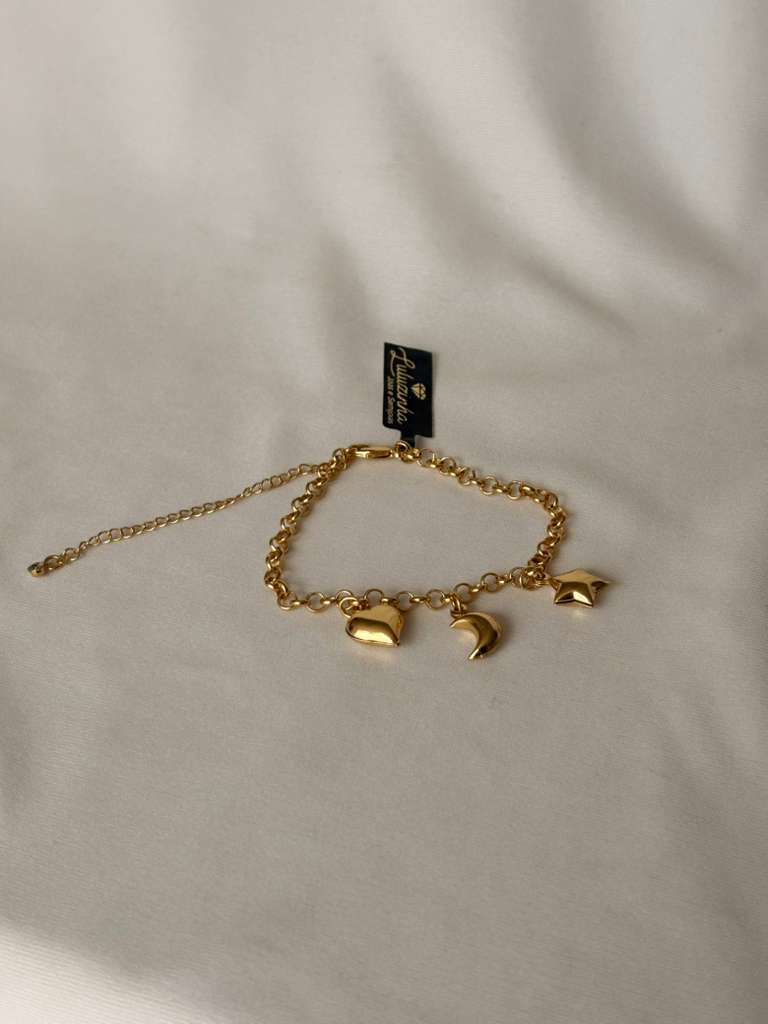 Esta pulseira delicada combina charme e significado com seus três pingentes especiais: a meia-lua, que simboliza intuição e mistério; a estrela, que representa esperança e inspiração; e o coração, um poderoso emblema de amor e afeto. Feita com uma corrente fina e ajustável, ela é perfeita para quem deseja carregar consigo esses símbolos cheios de energia positiva e beleza. Um acessório que une estilo e emoção, ideal para destacar o que realmente importa na vida.