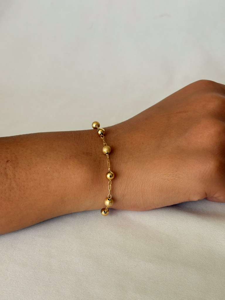 Esta linda pulseira banhada a ouro 18K apresenta um design elegante e minimalista, combinando sofisticação e delicadeza. O modelo é composto por pequenas esferas intercaladas, alternando entre bolinhas lisas com acabamento polido e bolinhas foscas com textura diferenciada, criando um contraste sutil e refinado. A corrente delicada e o fecho ajustável proporcionam um encaixe confortável e seguro no pulso. Ideal para quem busca um acessório versátil, que pode ser usado sozinho para um look discreto ou combinado com outras peças para um estilo mais elaborado.