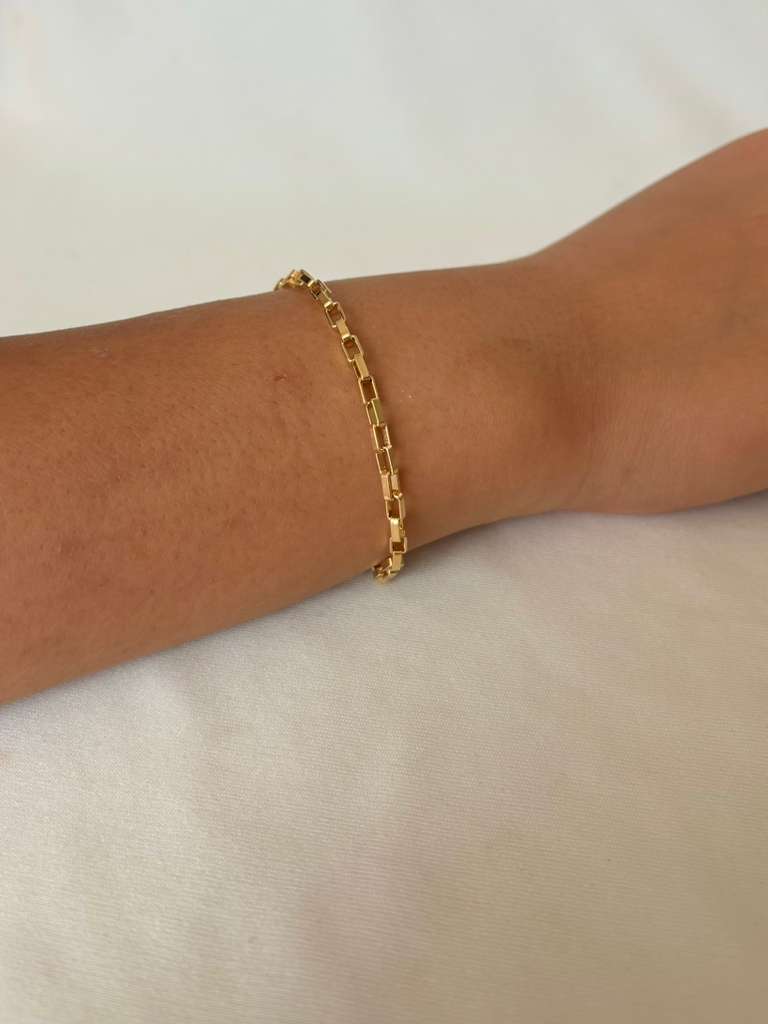 Esta é uma pulseira masculina banhada a ouro 18K com um design moderno e sofisticado. O modelo apresenta elos retangulares interligados, criando um efeito elegante e robusto ao mesmo tempo. Seu acabamento polido e brilhante realça a tonalidade dourada, proporcionando um visual luxuoso. O fecho tipo lagosta garante segurança e praticidade no uso.