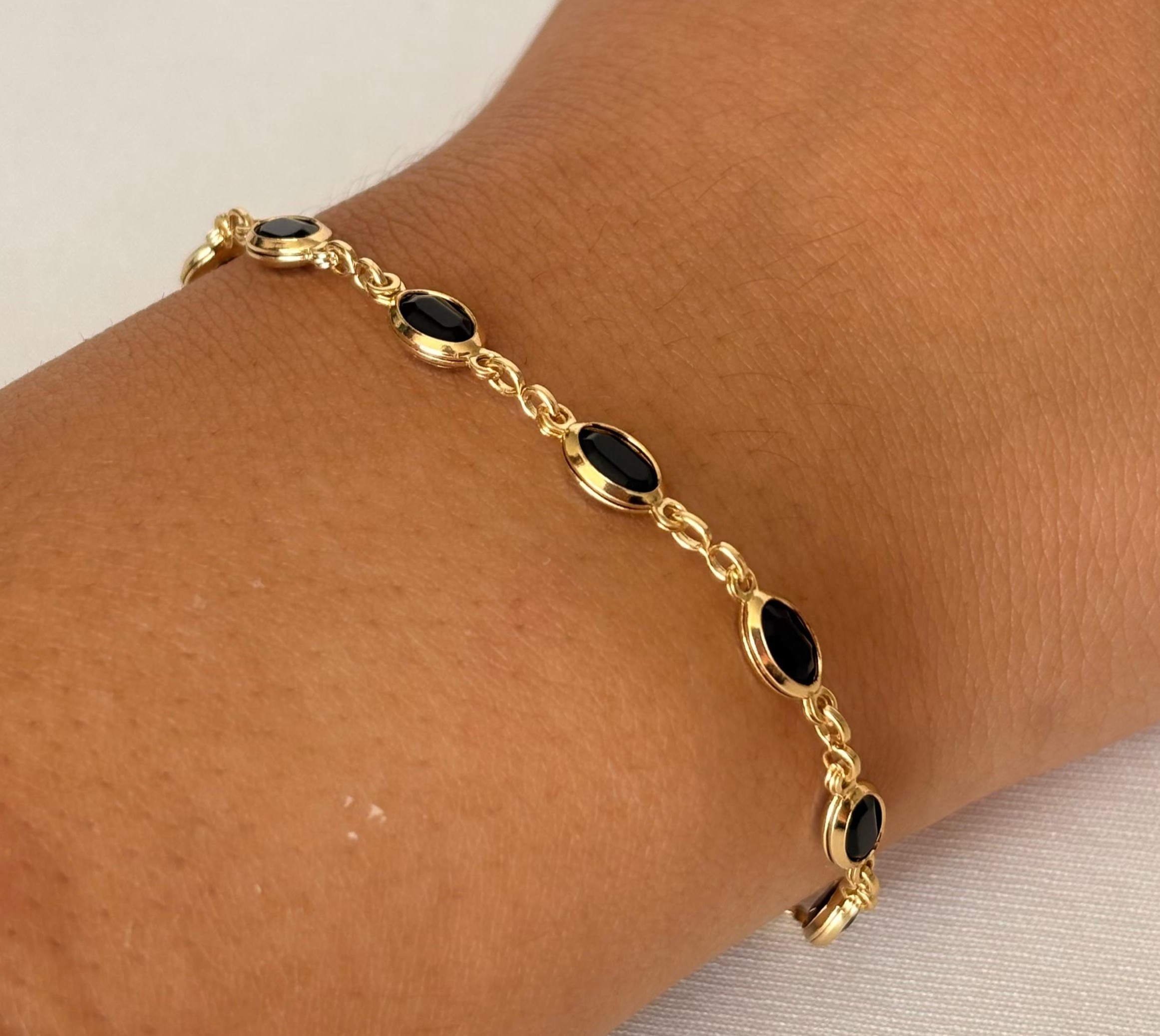 Pulseira elos ovais com pedras pretas cravejadas em estrutura banhada a ouro 18k. Design delicado com acabamento polido e fecho ajustável para melhor encaixe no pulso. As pedras ovais lisas proporcionam contraste elegante e sofisticado, ideal para combinações noturnas ou produções minimalistas com toque de destaque. Leve, resistente e de presença marcante.